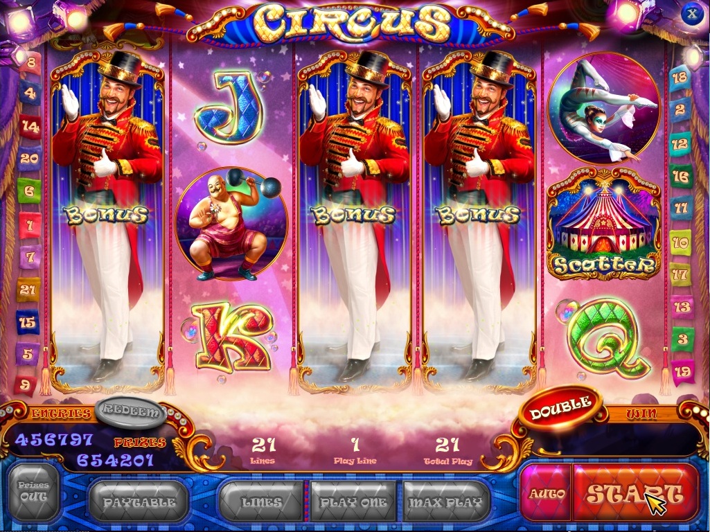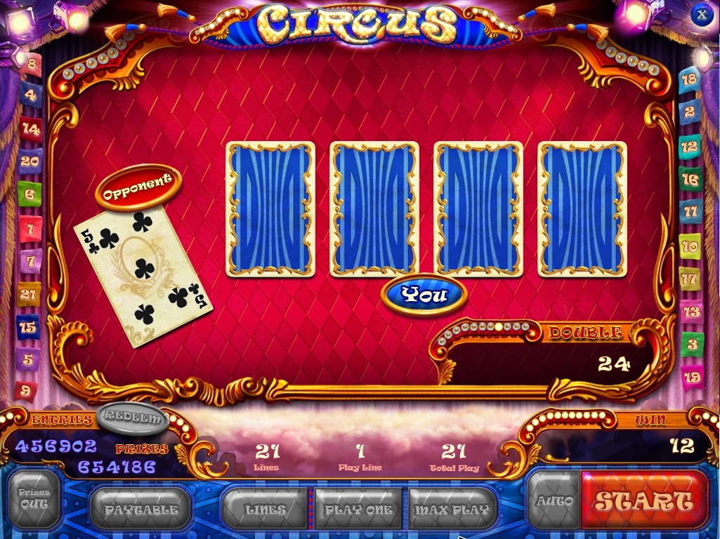 "Circus" - 21-line 5-reel slot with bonus game, a game of chance and free spins. Click "rate + / -" change the current bet per line: 1, 5, 10, 25, 50 cents or a dollar. Buttons "lines + / -" - Select the number of lines. The general rate is equal to the product of the number of lines on the size of the bet per line. "Risk" - if the payoff can double it a few times in a game of chance. "Start" - launches the game. "Autoplay" - automatic play.