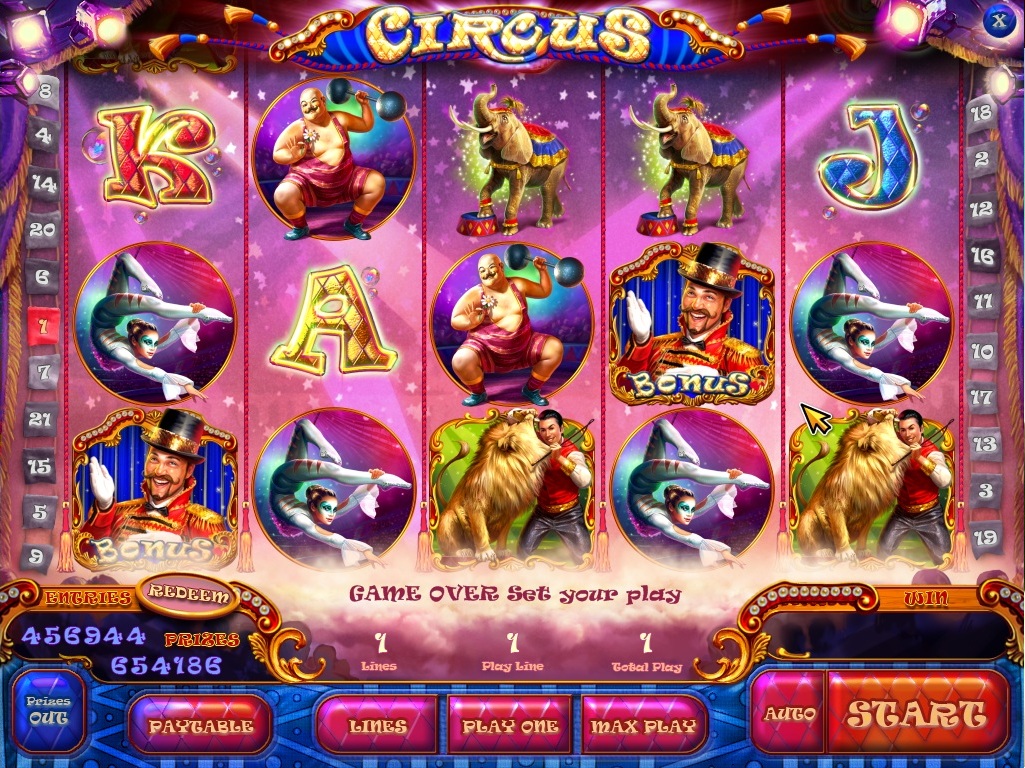"Circus" - 21-line 5-reel slot with bonus game, a game of chance and free spins. Click "rate + / -" change the current bet per line: 1, 5, 10, 25, 50 cents or a dollar. Buttons "lines + / -" - Select the number of lines. The general rate is equal to the product of the number of lines on the size of the bet per line. "Risk" - if the payoff can double it a few times in a game of chance. "Start" - launches the game. "Autoplay" - automatic play.